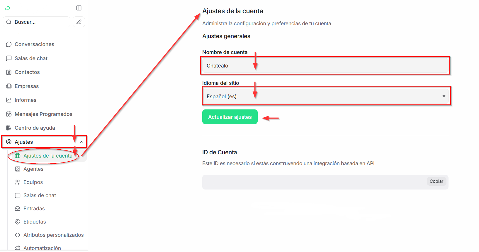 Elige tu idioma preferido del menú desplegable. Esto mostrará tu panel de control y conversaciones en el idioma seleccionado. Por ejemplo, selecciona Español (es) del menú desplegable para usar Chatealo en español.