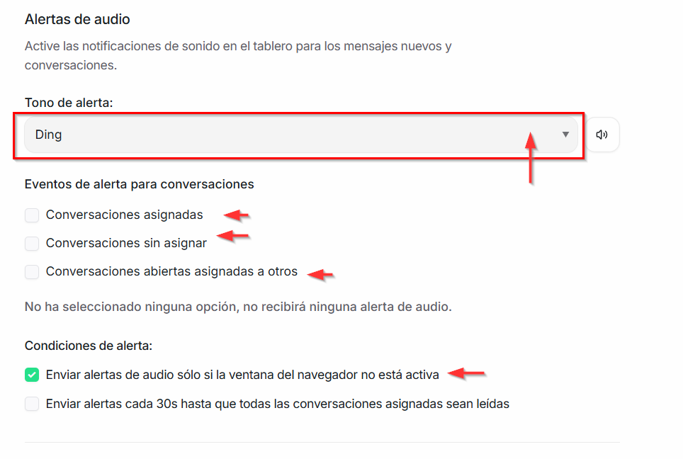 Alertas de audio: Permite activar y configurar diferentes tipos de notificaciones, push o sonoras para distintos tipos de conversaciones. Podrás seleccionar el Tono, los Eventos de alerta que las generarán y definir las Condiciones de alerta bajo las que se activarán, ayudando a no perder mensajes importantes.Preferencias de notificaciones: Permite configurar cómo y cuándo recibir notificaciones, pudiendo definir prioridades y elegir la forma de aviso, como correo electrónico o notificaciones push.