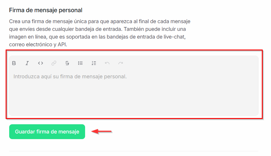 Firma personalizada: Permite configurar un mensaje o firma que se incluirá automáticamente en tus conversaciones.