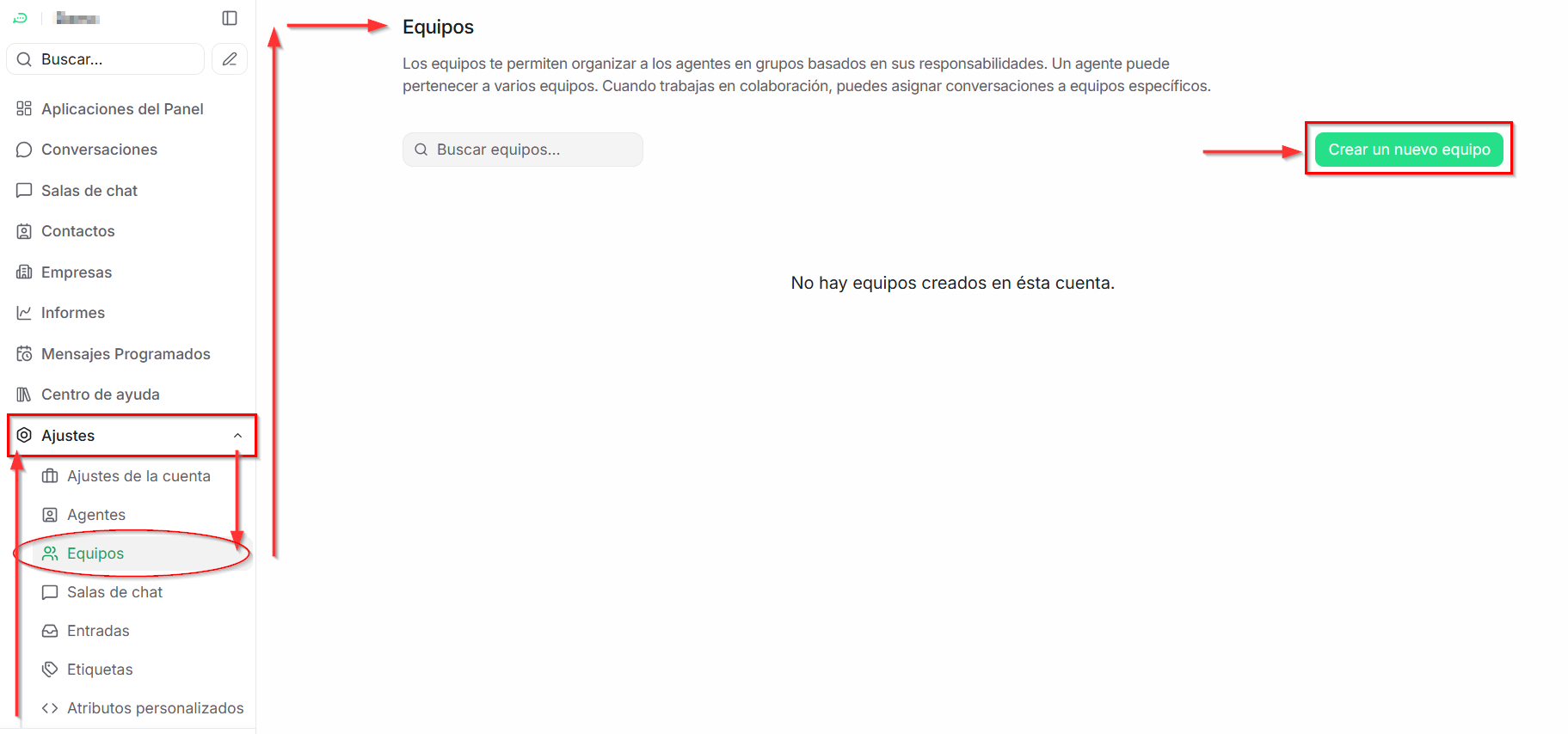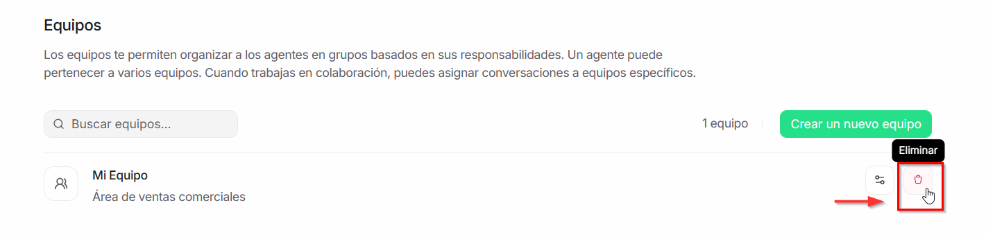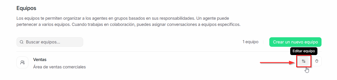 Los equipos son una herramienta clave para organizar a los agentes según sus responsabilidades dentro de la empresa. Además, un mismo usuario puede formar parte de varios equipos y asignar conversaciones a un equipo cuando trabaja de manera colaborativa.