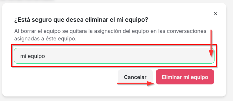 Antes de finalizar, deberás ingresar nuevamente el nombre del equipo que deseas eliminar, como medida de confirmación en caso de haber seleccionado esta acción por error.