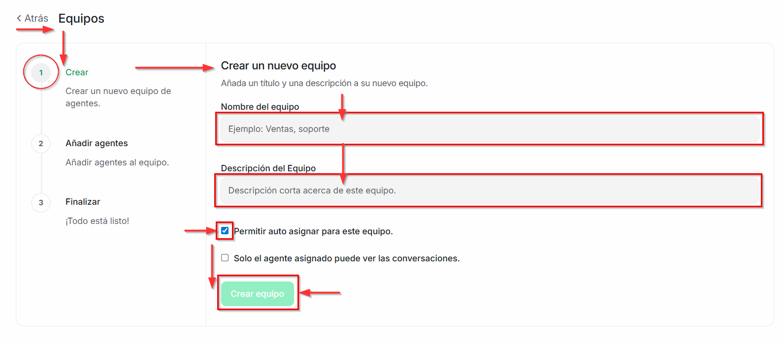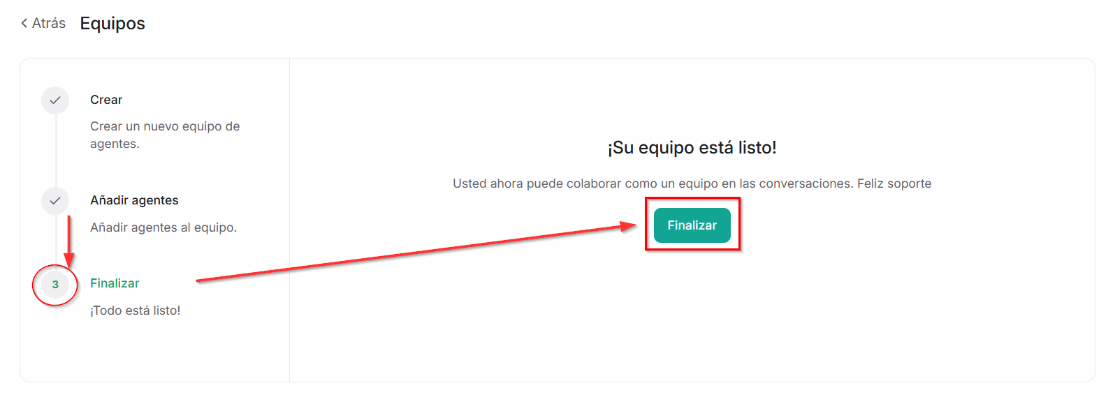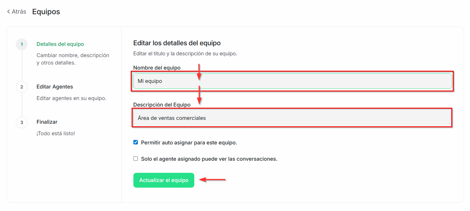 En los siguientes pasos podrás modificar los datos creados, como el nombre y la descripción del equipo, así como también la vinculación de los agentes.