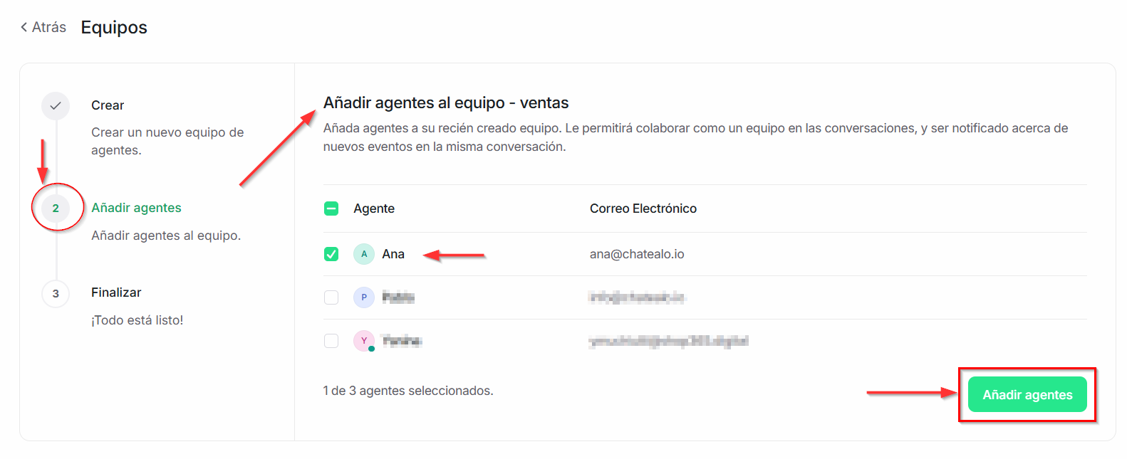 Luego, selecciona a qué agentes quieres vincular al equipo. Aparecerá un listado de agentes y podrás vincularlos al equipo marcando su casilla.Finalmente, selecciona "Añadir agentes" y "Finalizar".