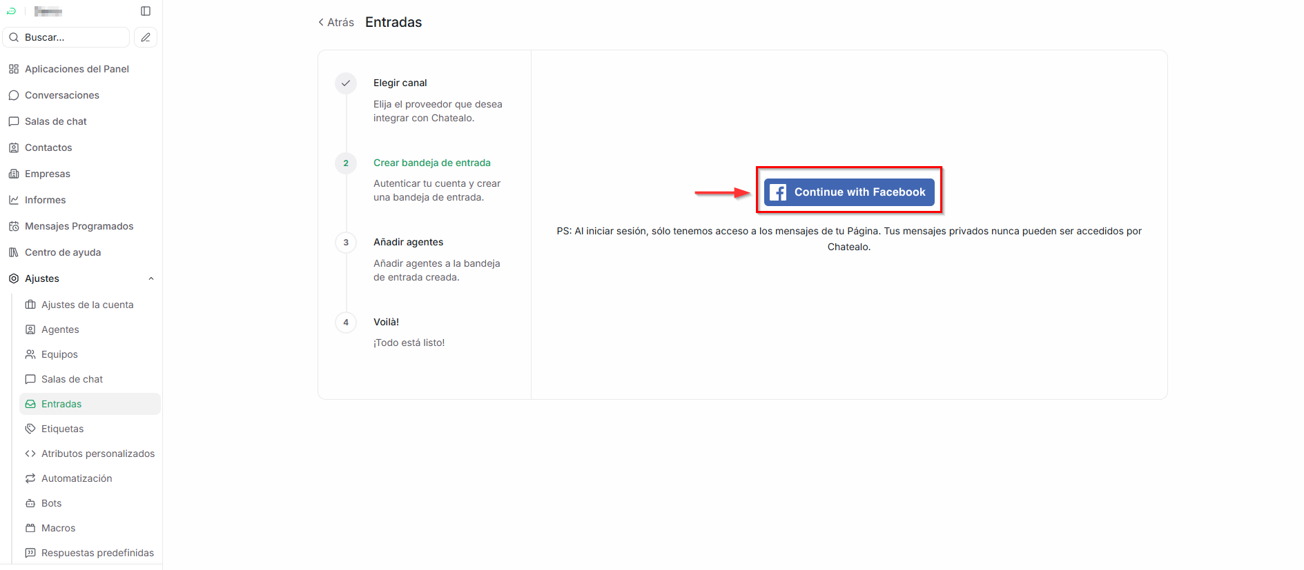 Si deseas gestionar los mensajes de tu página de Facebook directamente en Chatealo, sigue estos pasos sencillos. 🔧