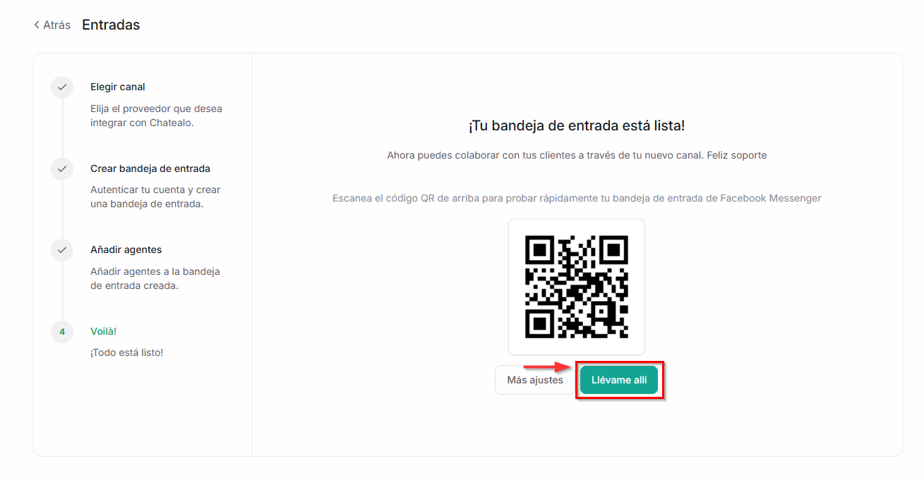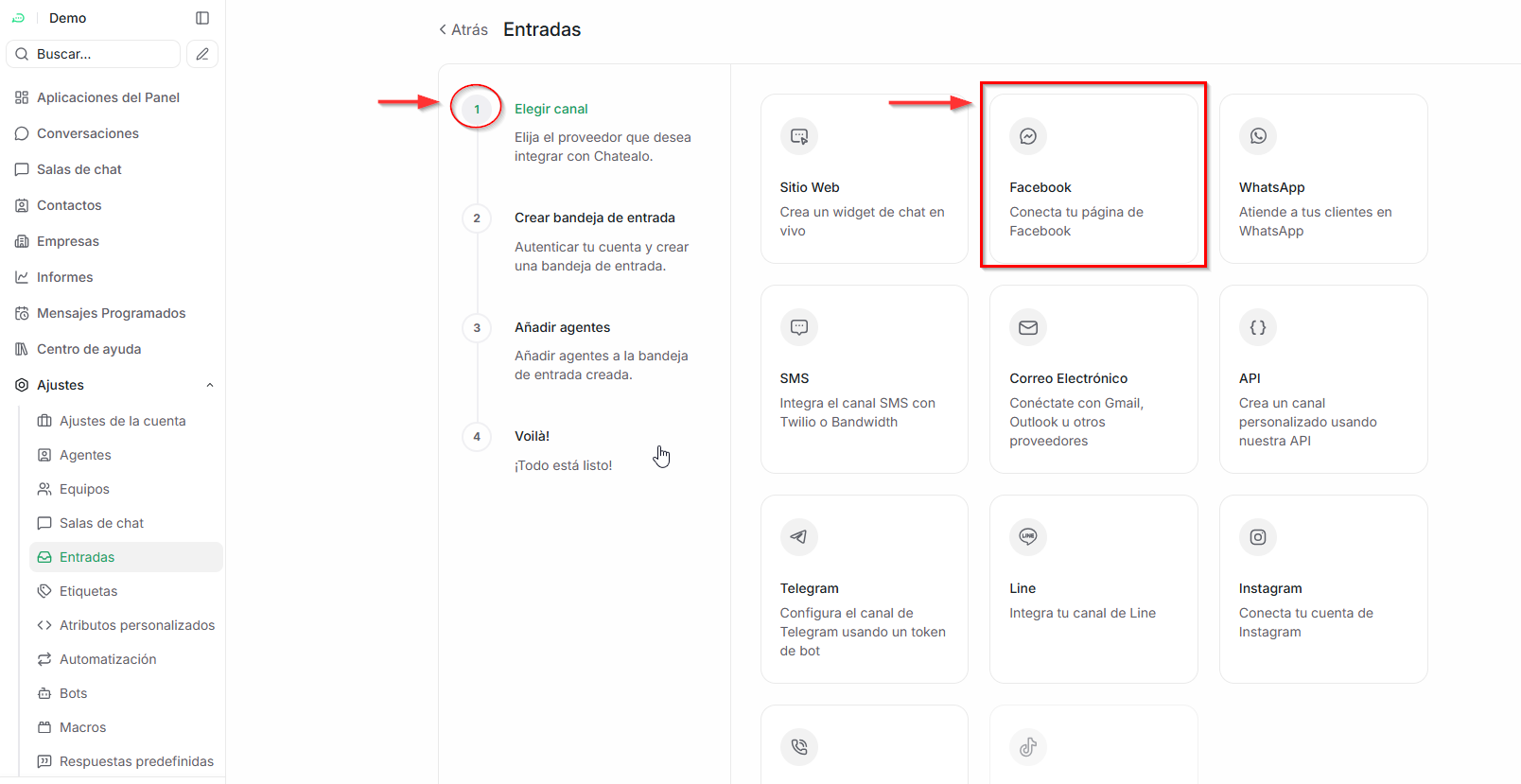 Tu bandeja de entrada de Facebook aparecerá en la lista de buzones de entrada de Chatealo. Para realizar ajustes adicionales, sigue estos pasos: