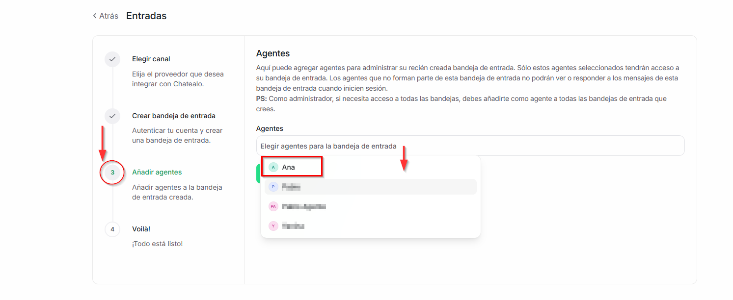 6️⃣ Agrega agentes 👥 para que gestionen los mensajes de esta bandeja de entrada, en el paso siguiente, presioná el espacio →**“Elegir agentes para la bandeja de entrada”**. Se mostrará un listado de los agentes disponibles, desde donde podrás seleccionar los que quieras incorporar.