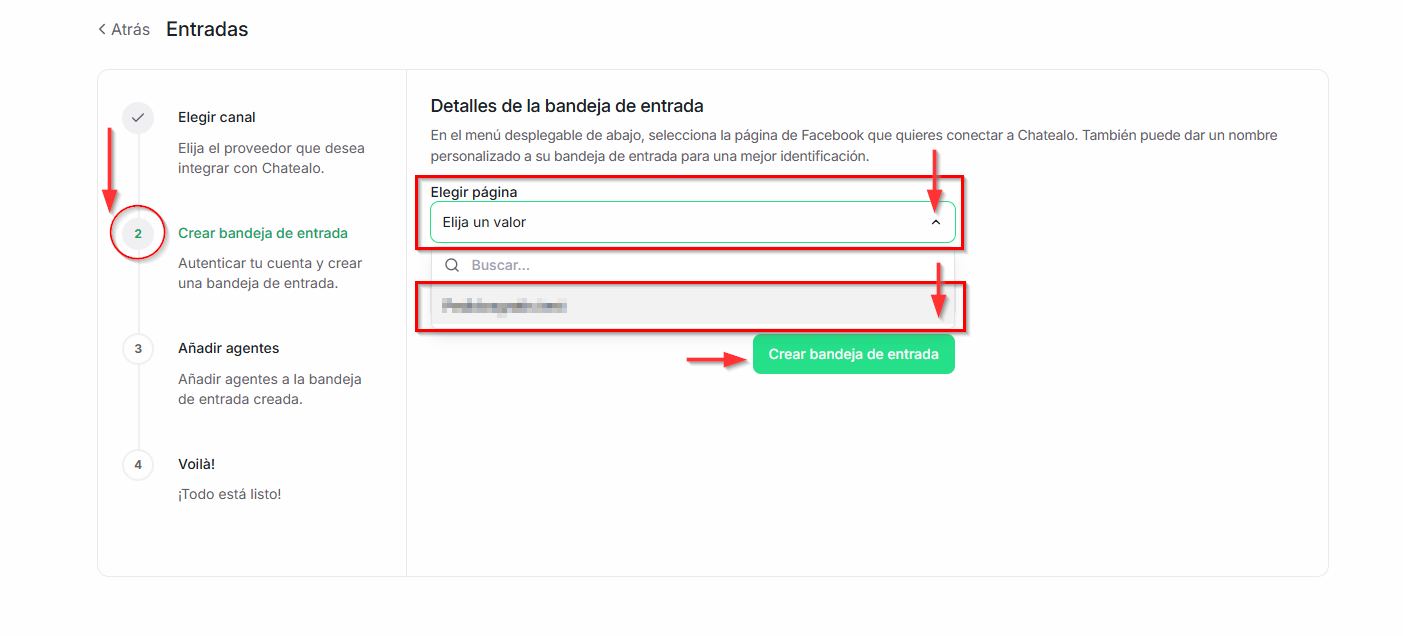 5️⃣ Ahora verás un menú desplegable en Chatealo donde podrás seleccionar la página de Facebook que conectaste, del menú desplegable eligé tu página a conectar y realiza clic en → "Crear bandeja de entrada" para finalizar.