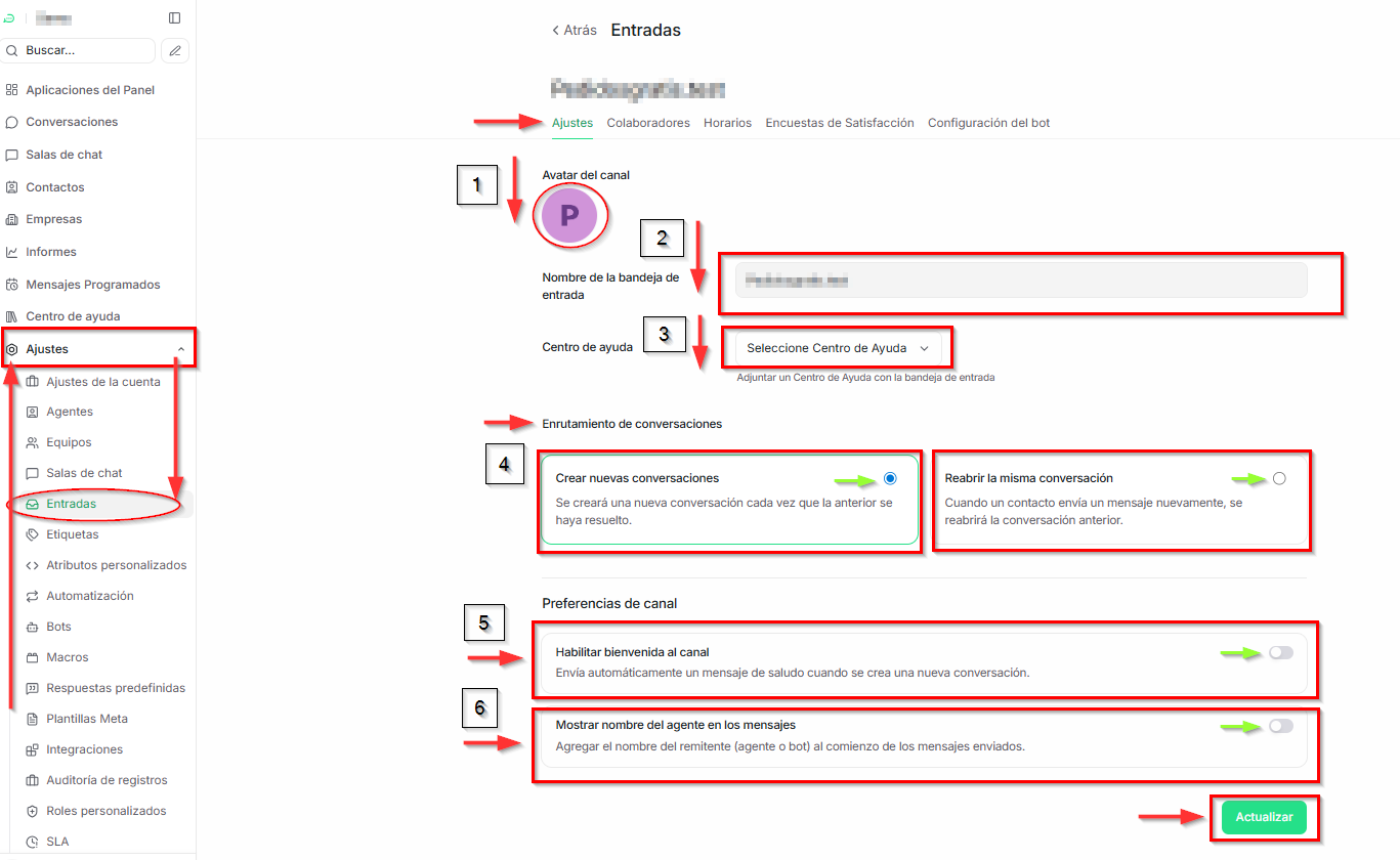→ 4. Enrutamiento de conversaciones: Podras habilitar si deseas que al escribir nuevamente un contacto que ya haya tenido una conversacion previa finalizada, se cree una nueva conversacioón o se reabra la conversación anterior para continuar.