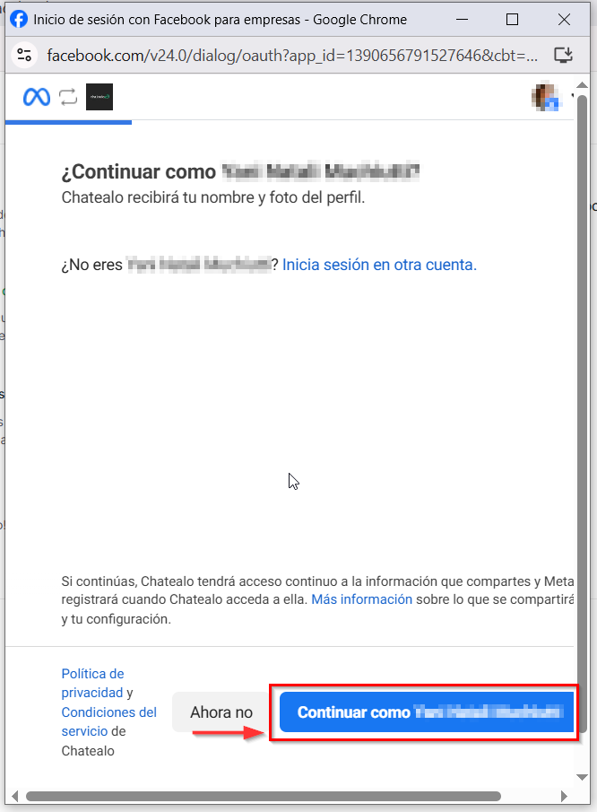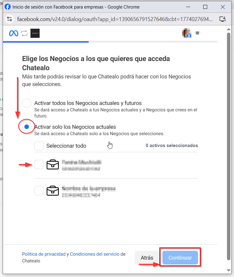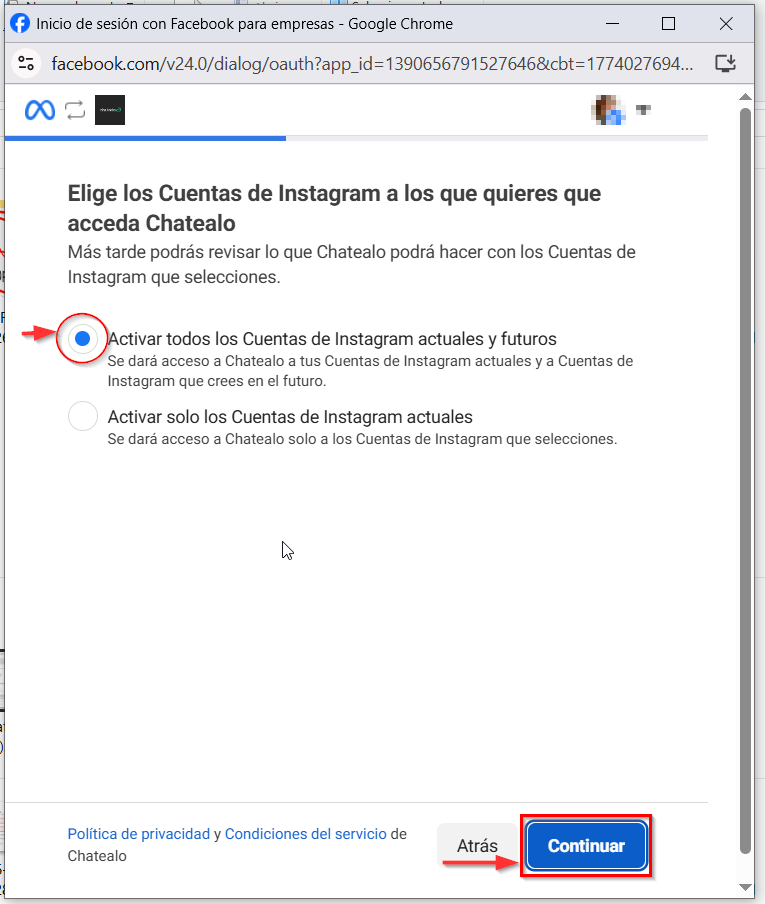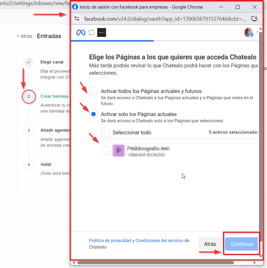 Selecciona las páginas que saean conectadas y realiza clic en → "Continuar"