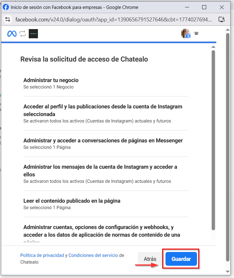 ✅ Importante: Habilita todos los permisos para permitir que Chatealo gestione tus mensajes sin problemas.