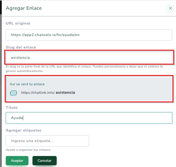 El link se generará automáticamente en el campo → Slug del enlace. Verás tu nuevo link generado de manera completa en → Así se verá tu enlace.