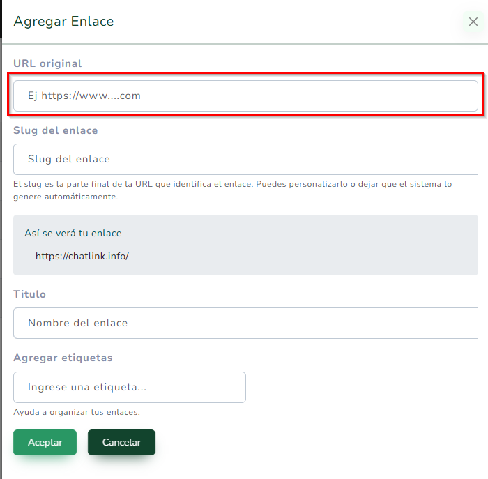 👉 La parte inicial (https://chatlink.info/) no es editable, ya que permite registrar estadísticas.